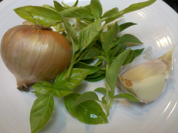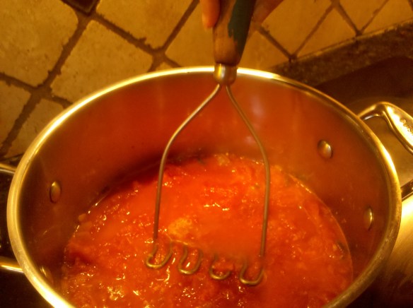 When faced with going out to the store for tomatoes with all of the crazies buying batteries and milk, Ed decided hunting down more tomatoes from the garden was the preferable option. These were not the grade A tomatoes I just ruined (shown below, RIP), but there were enough to make another sauce. I was kind of hoping he would have fetched me a couple jars of Barilla at this point, but sometimes you just have to start over. I put on Pandora’s French Cafe music station and got back to work.