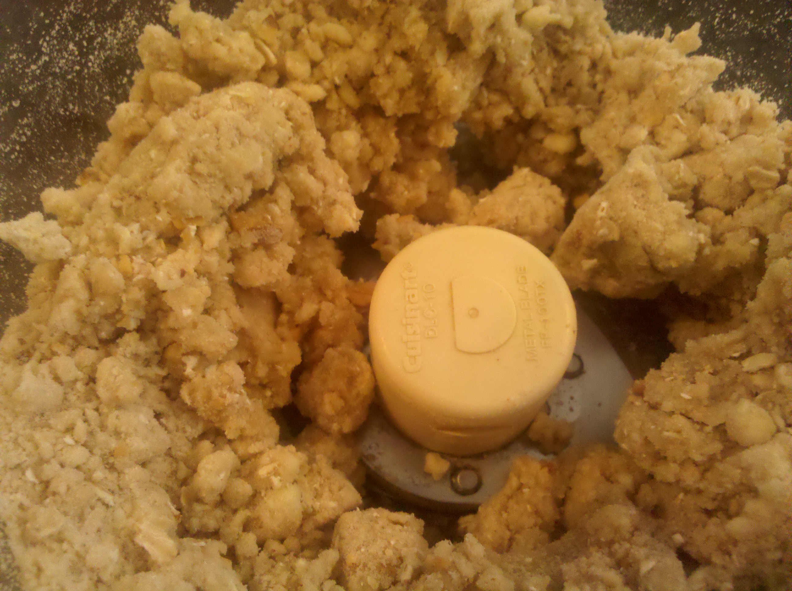 Combine all of the ingredients in a food processor except the water. Pulse until combined, this will take about 30 seconds. Add water, 1 tablespoon at a time until mixture is clumpy but crumbly.