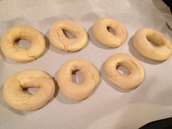 10. Test the bagels by placing one in a bowl of cold water. If it sinks and doesn’t float to the surface, return it to the sheet, wait 15 minutes and then test it again. When one bagel passes the float test, they are ready for the pot.