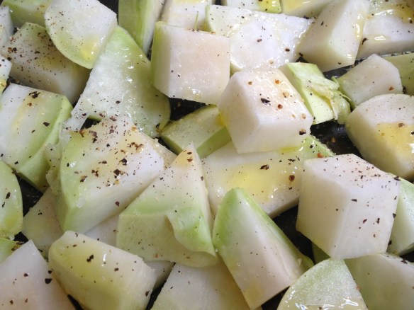 I cubed it and then tossed it with olive oil, salt and pepper and roasted it at 400 degrees for about an hour. Halfway through, I gave it a good stir, then returned it to the oven.