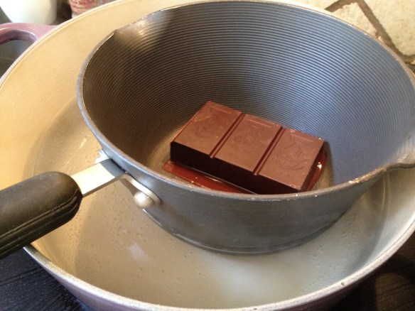 When you are using chocolate of this caliber, I suggest you melt it slowly in a double boiler rather than a microwave. You don’t need any fancy equipment to fashion a double boiler, just a small pot placed in a larger pot. This link explains the technique in case you’re unfamiliar or intimidated. Don’t be! It’s worth the ten minutes of extra effort.