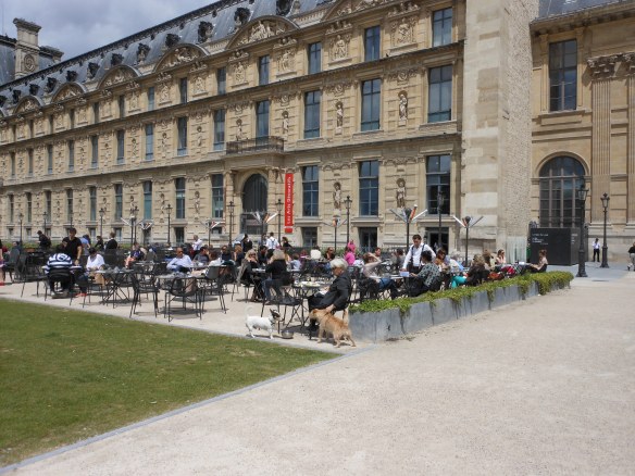 I have found that it is the little things about Paris which have charmed me the most. We arrived and walked right to the massively overwhelming Louvre, where we saw countless Parisians and their little dogs on the beautiful grounds. Even the dogs have a delightful joie de vivre, frolicking in the shadow of the world’s greatest art collection with reckless abandon. I tend to keep a short leash on both my pets and my children, so I watched with wonder while a little Jack Russell terrier ran freely across acres of hundreds of people and their dogs, owner nowhere in sight and yet no doubt well cared for. He wound up at a fancy outdoor cafe near the pyramids, where a formidable older woman was dining with her dog, complete with a silver bowl of water on the ground. The Jack Russell waltzed right up and helped himself to the other dog’s water, and I shot the picture below. I don’t know why it made me so happy, but it did. It also made me question why I am so uptight. I would never allow my dog to do that, and yet is was such a joyful thing to watch. Maybe these Parisians are on to something.
