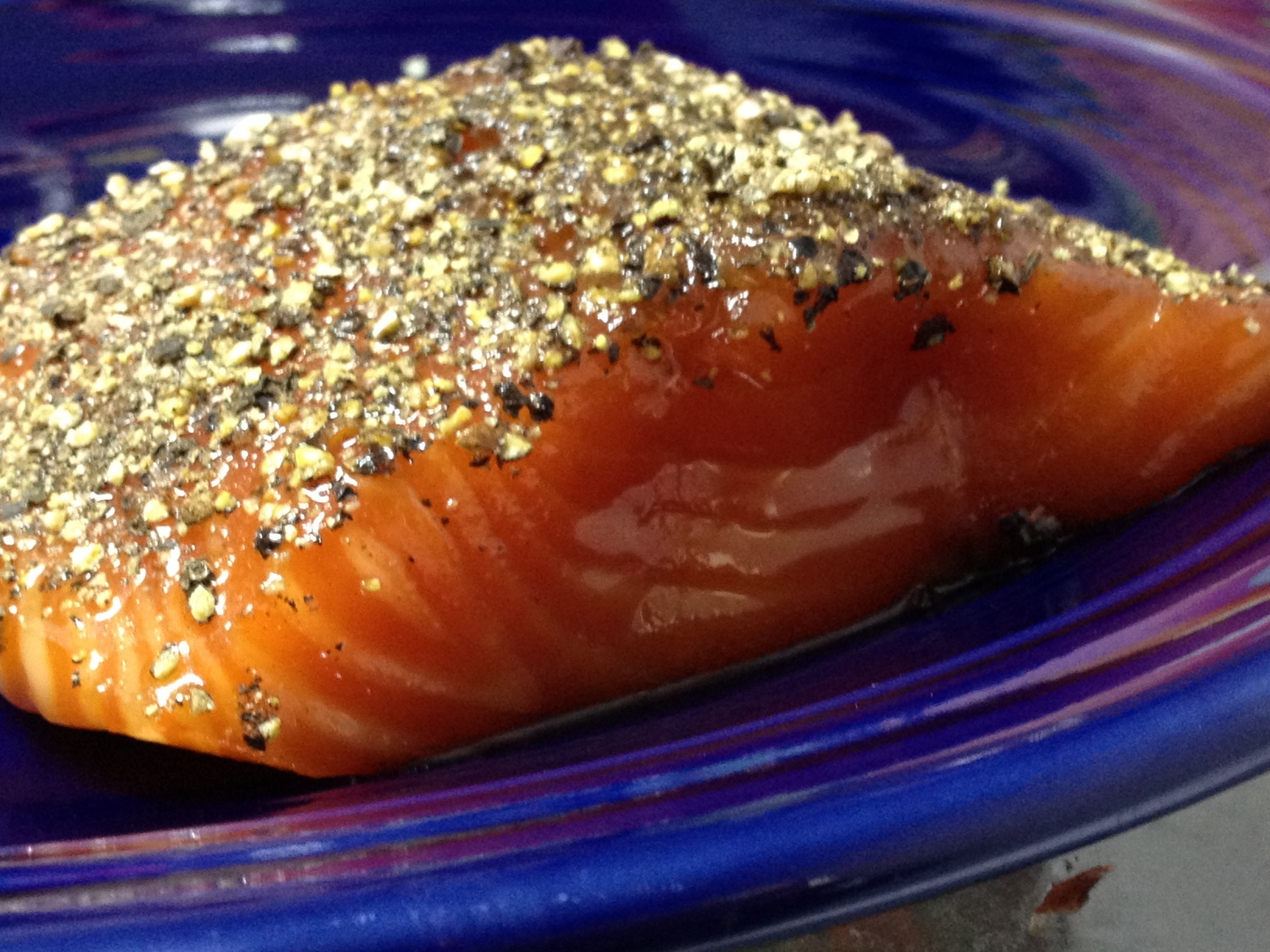 Grill for approximately 3 minutes per side, starting with pepper side down, or until salmon is just on the verge of turning opaque.