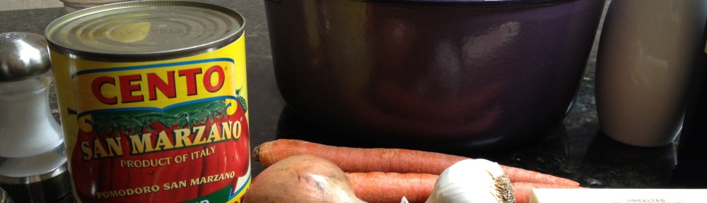 This is not Luisa’s recipe (and I’m only being clear about that since lately I’ve wound up with a lot of traffic from people who were searching for that recipe online); I have added garlic and crushed red pepper, as well as subtracted some of the meat. The spirit is the same, but the details are different. I do think it’s important to spring for canned whole San Marzano tomatoes (assuming you don’t have tomatoes plucked fresh from your garden, that is). One thing Luisa did drill in my head, however, is that the ultimate secret ingredient in this sauce is time. If you can start this before 11:00 am, you will have a happy family come dinner time.